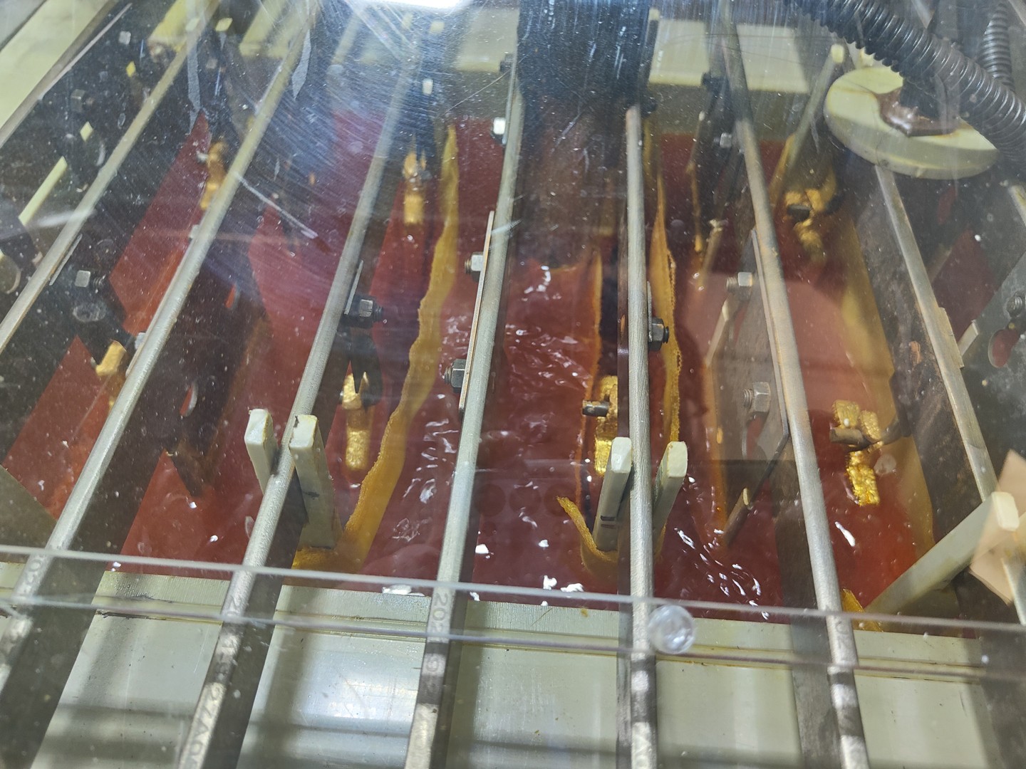 該工藝具有過程穩定,易于控制,污染小,勞動強度小等優點,但是存在生產周期長(時間是化學法精煉的2-3倍),電解液金占壓大(10kg/d金電解,電解液中共計占壓黃金4kg左右)